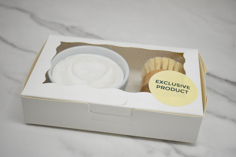 Keep your kitchen fresh, clean, and eco-friendly with our Dish Soap Combo Set. This set includes our 4 oz Lemon Solid Dish Soap in a reusable ramekin dish paired with a bamboo scrubbing brush with sisal bristles — a sustainable swap for everyday dishwashing.