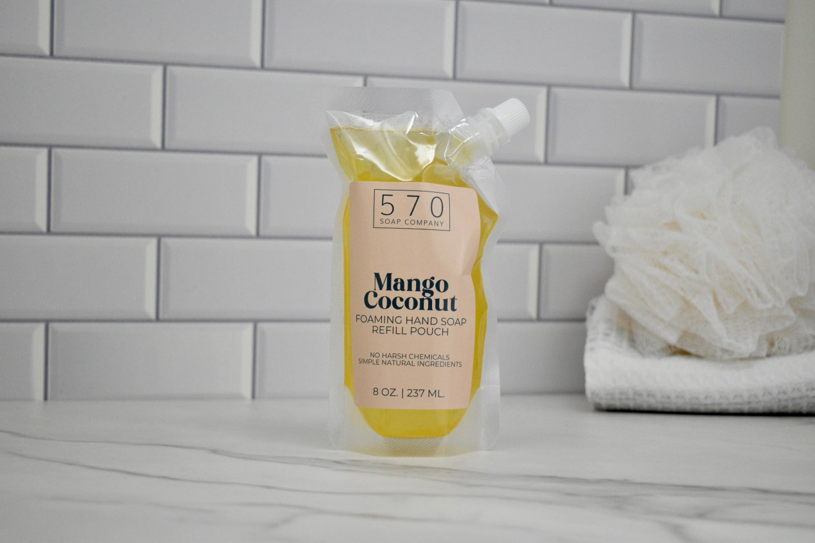 Escape to a tropical paradise with our Mango Coconut Natural Foaming Hand Soap. Infused with an irresistible blend of mango slices, pineapple chunks, orange zest, and a splash of coconut milk, this hand soap offers a delightful and refreshing handwashing experience. Crafted with a blend of natural ingredients, it gently cleanses and nourishes your skin, leaving your hands feeling soft and rejuvenated. Available in an 8.5 oz (251 ml) foaming pump bottle or an 8 oz (237 ml) refill pouch for your convenience.