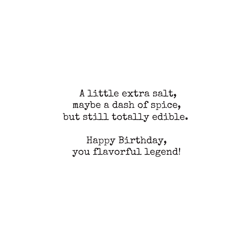 "A little extra salt, maybe a dash of spice, but still totally edible. Happy Birthday, you flavorful legend!"